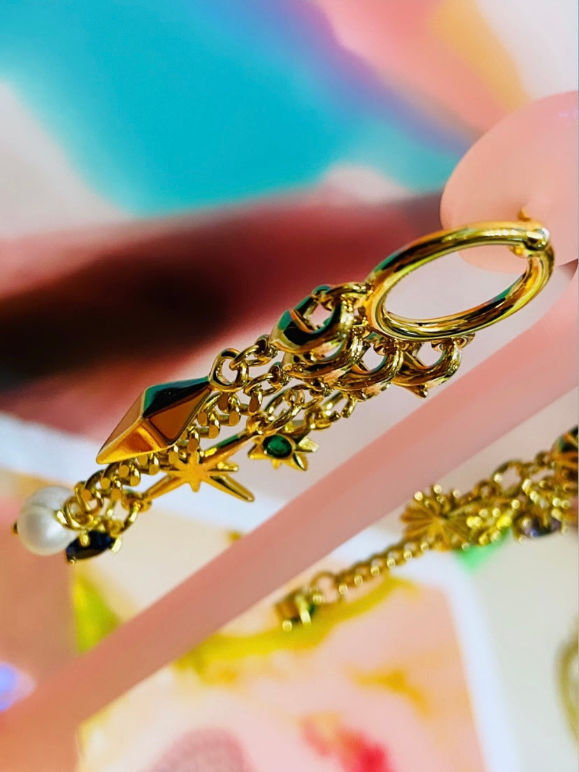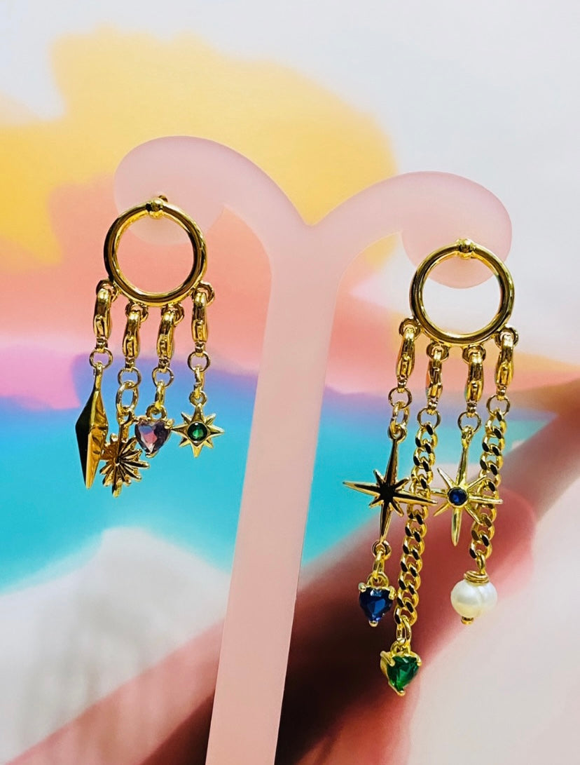 Aretes de círculos con cuatro asas y ocho dijes con ganchos y dijes variados.