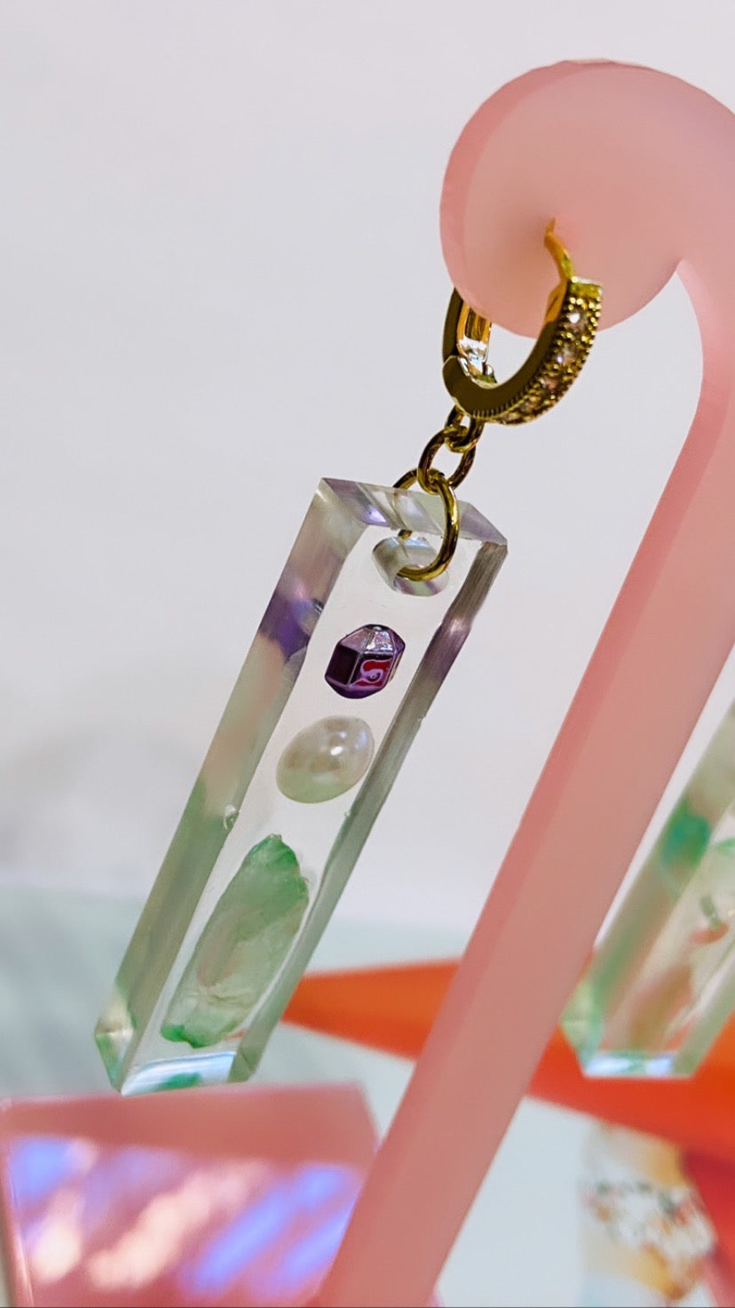 Aretes elaborados a mano en resina epóxica con cuarzo rutilado y piedra hematita. Todos los postes de nuestros aretes son de oro laminado, hipoalergenicos y resistentes al sudor y al agua salada. Materiales: Resina, piedra natural y oro laminado