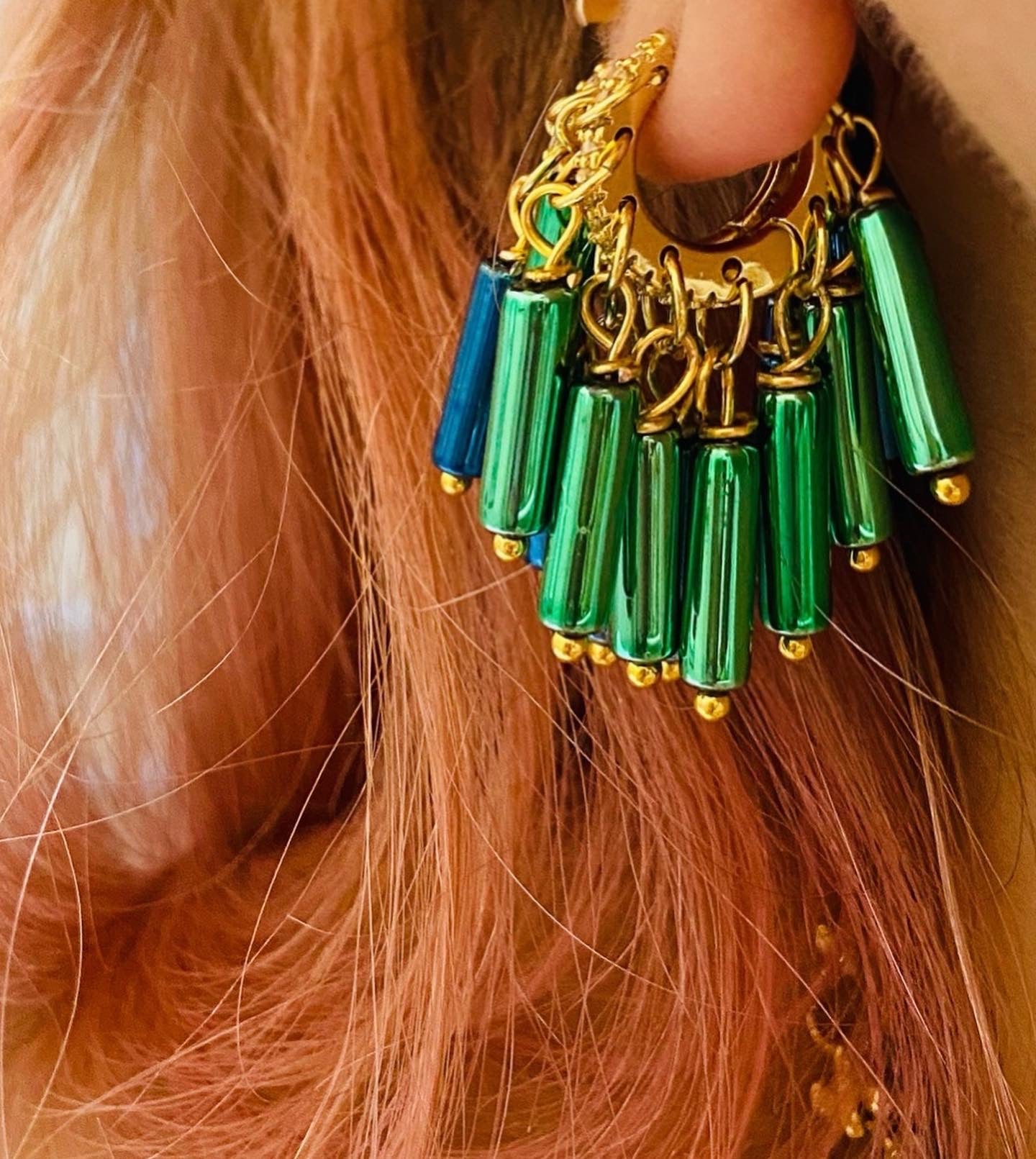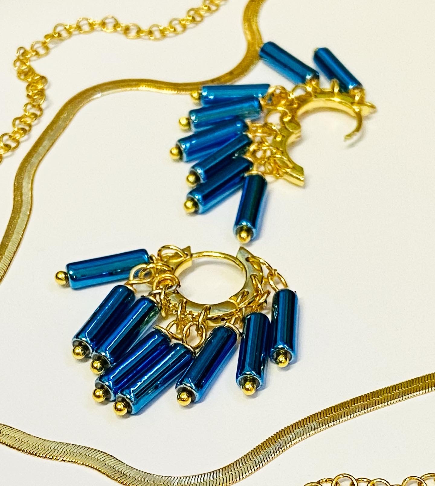Arracadas en oro laminado y zirconias con cilindros de piedra hematita natural galvanizada