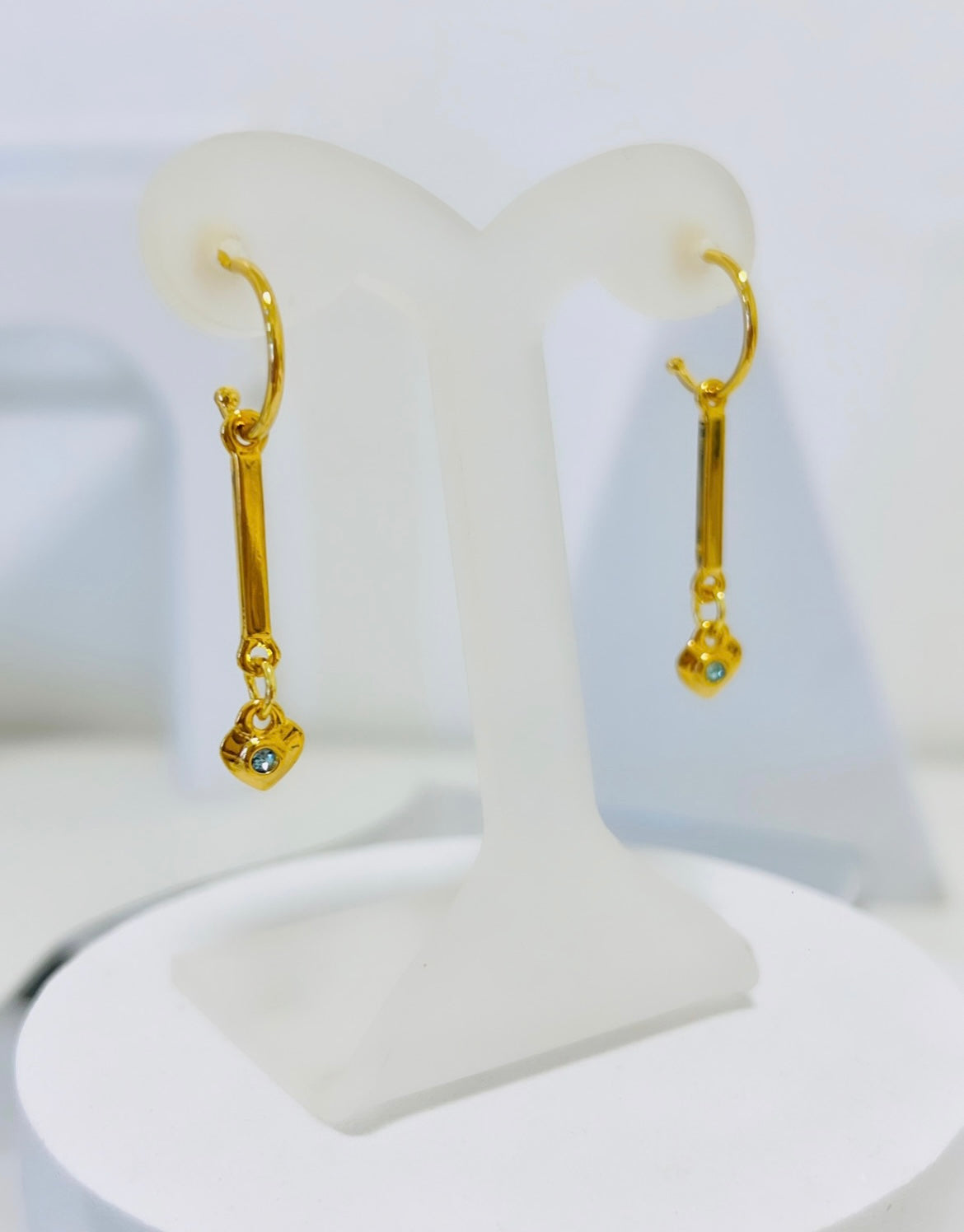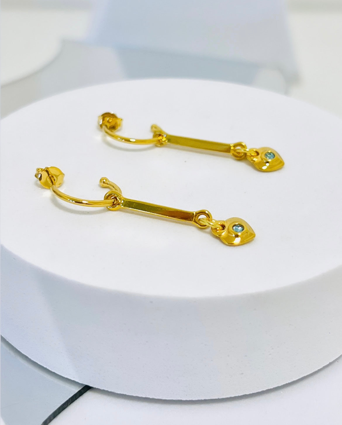 Arracadas en oro laminado 24k con dijes de barra lisa y corazón mini con cristal azul.