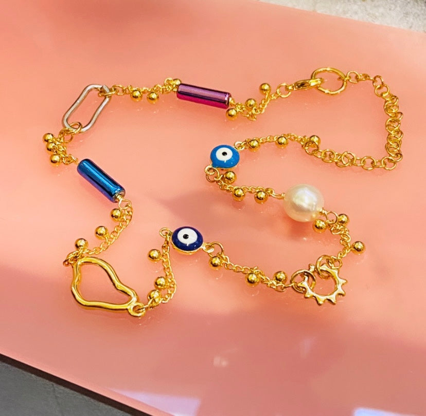 Gargantilla con cadena de bolas doradas y dijes variados de piedra natural y oro laminado. Tiene eslabones y figuras donde puedes colgar dijes con ganchos.