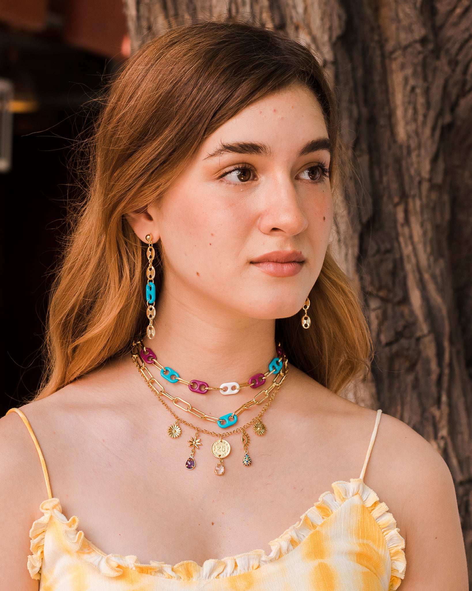 Collar con composición de dijes de flores, ojito, moneda y gotas de cristal con churumbelas. Oro laminado.