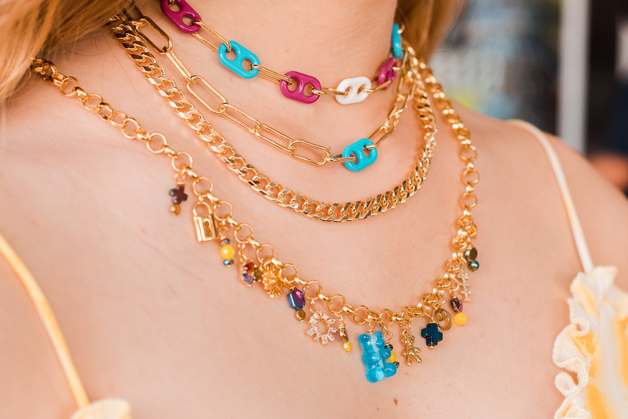 Collar con dijes  inspirados en los años noventa en oro laminado y piedra natural y pandita de resina central en color azul.