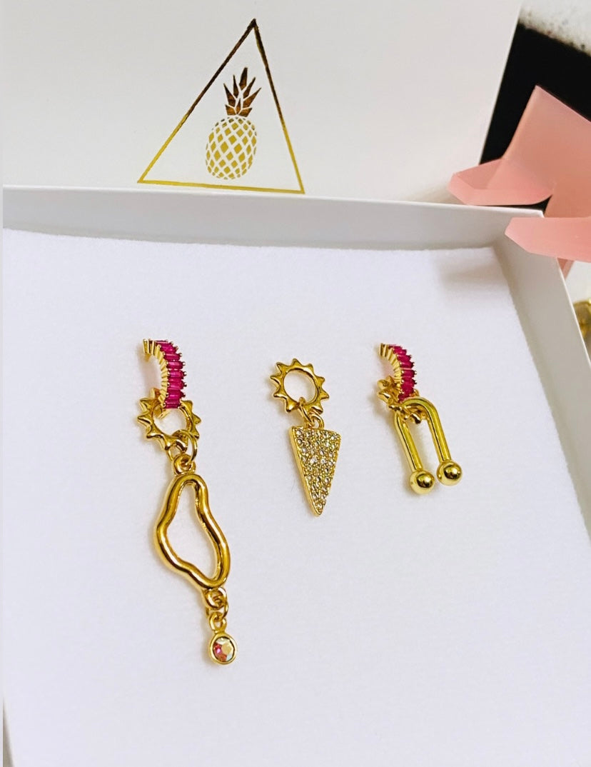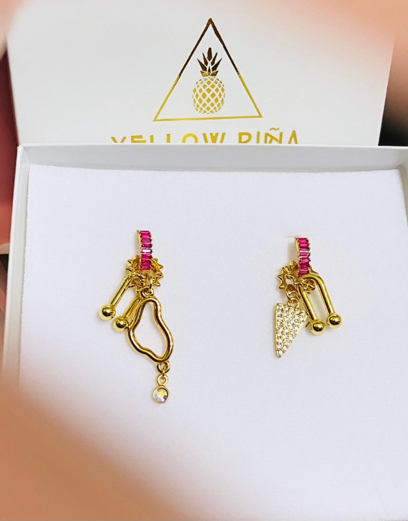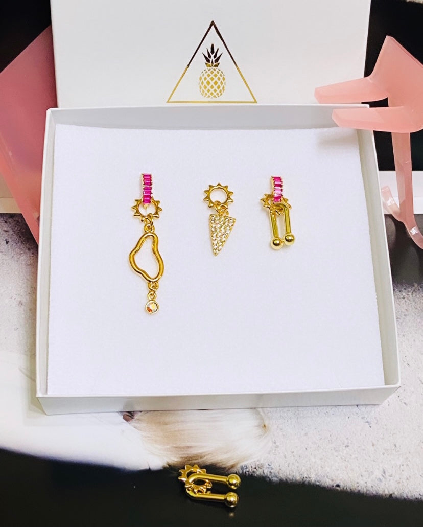 Paquete de arracadas con churumbelas rosa fucsia y 4 dijes para arracadas intercambiables. Puedes usar los aretes sencillos, asimetricos o con todos los 4 dijes.